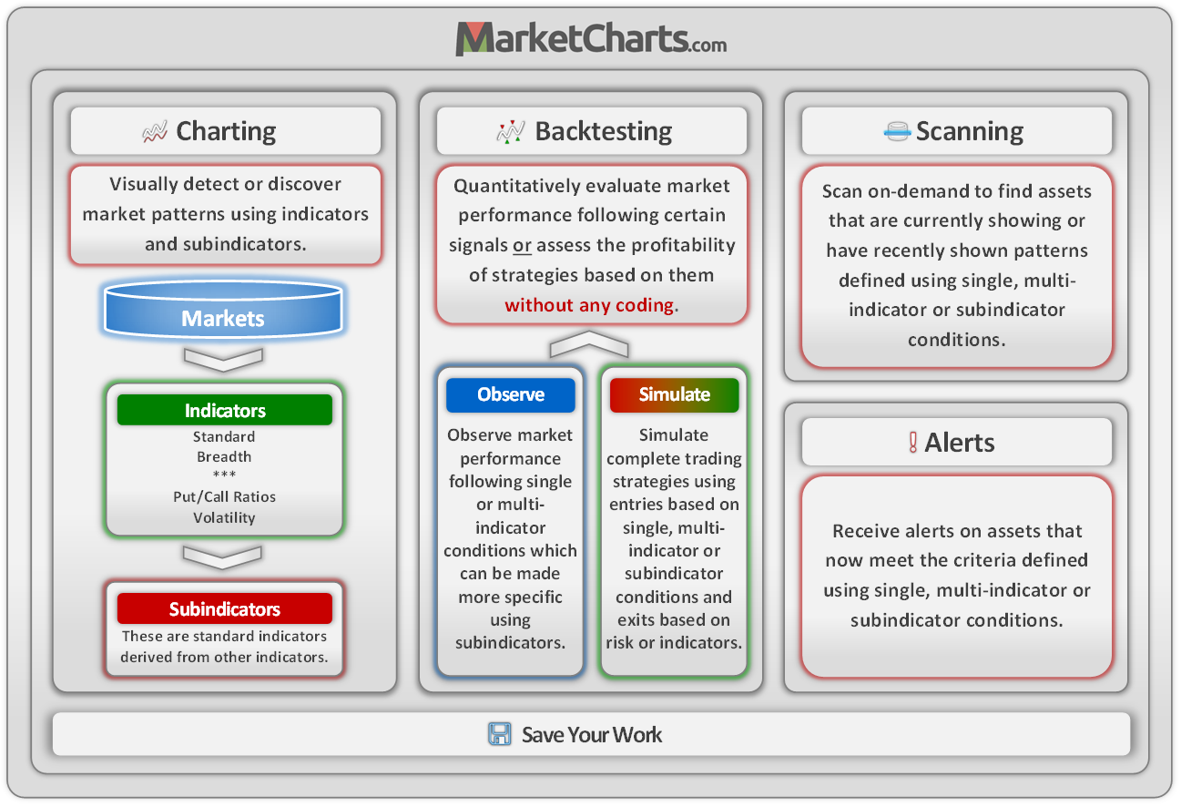 Study prices and broad market dynamics using a huge collection of indicators, then go further by applying subindicators to develop new insights.